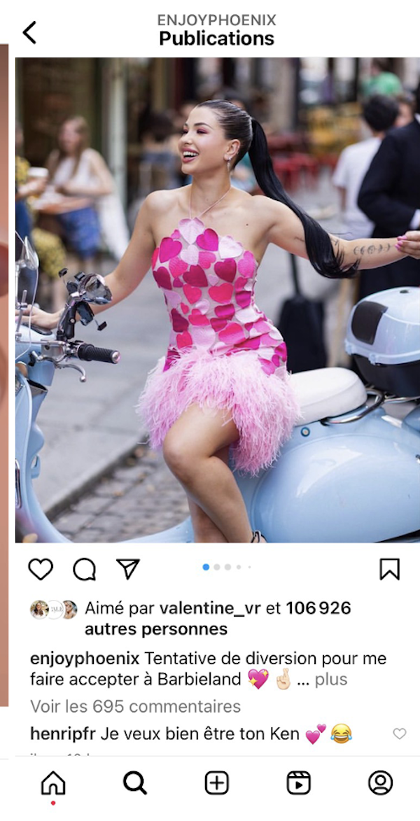 Prenons l’exemple d’EnjoyPhoenix, alias Marie Lopez, influenceuse star qui compte plusieurs millions d’abonnés sur divers canaux. Pour un seul de ses posts Instagram (1er temps de l’influence), on peut observer que l’influence est démultipliée par les interactions des publics (2e temps de l’influence) comme on peut le voir avec les 106 926 likes et 695 commentaires suscités par le post ci-dessus.